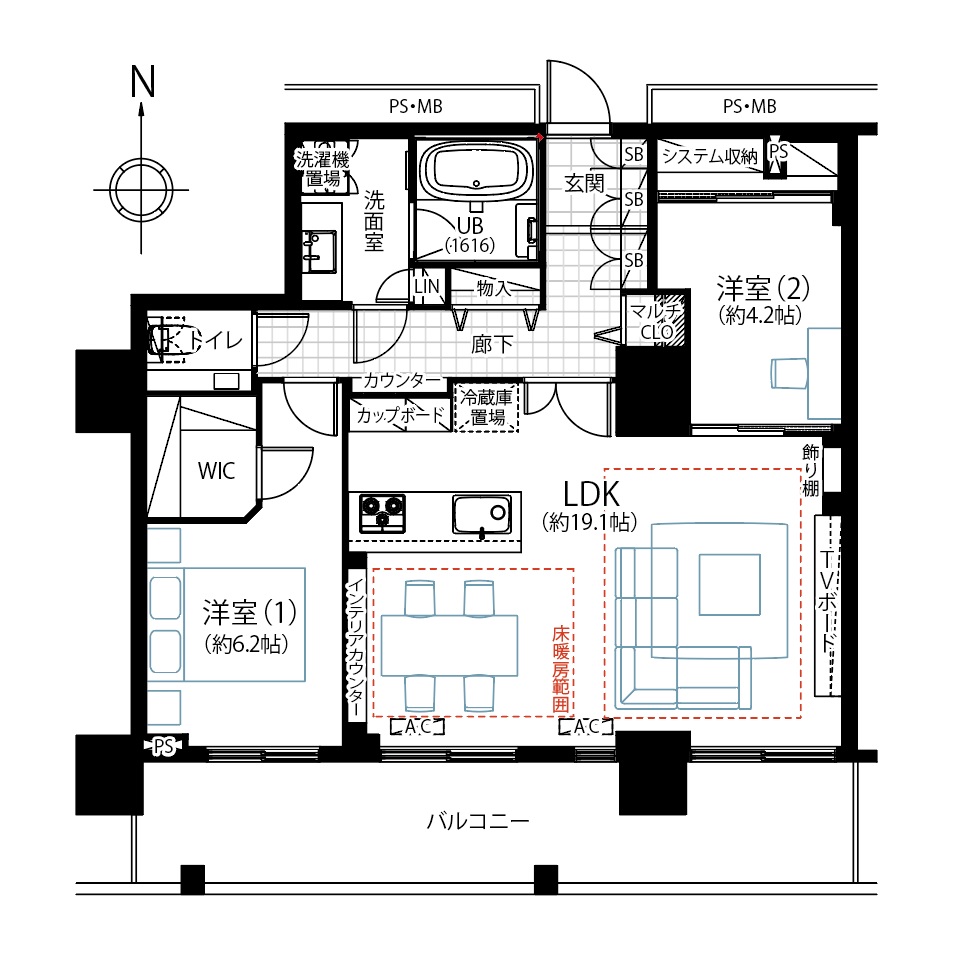 1. 客廳與飯廳設有床暖房的2LDK