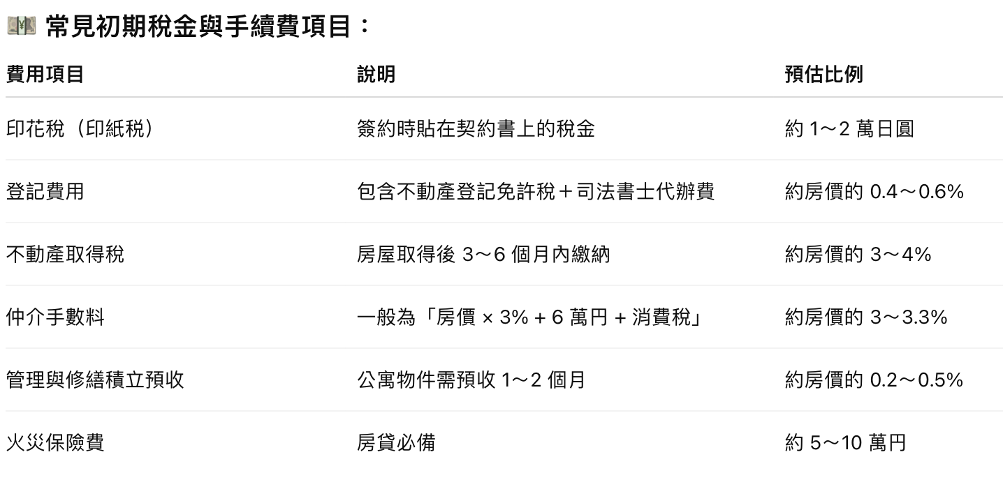 由於日本二手市場成熟,購買中古公寓時,初期稅金比例通常略低(約 5~6%)。